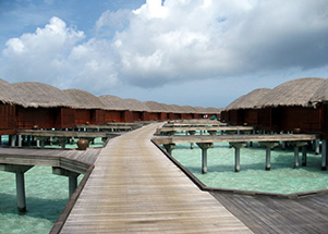 走近水上王國,首先會看到有個勇士沖浪通道,上面有座仿真茅草亭子,接著就會被一座巍峨的雪山所吸引,這里是喜馬拉雅雪人的家鄉,跟隨雪人可以攀上高峰,參觀山頂的滑雪小屋,在雪人家